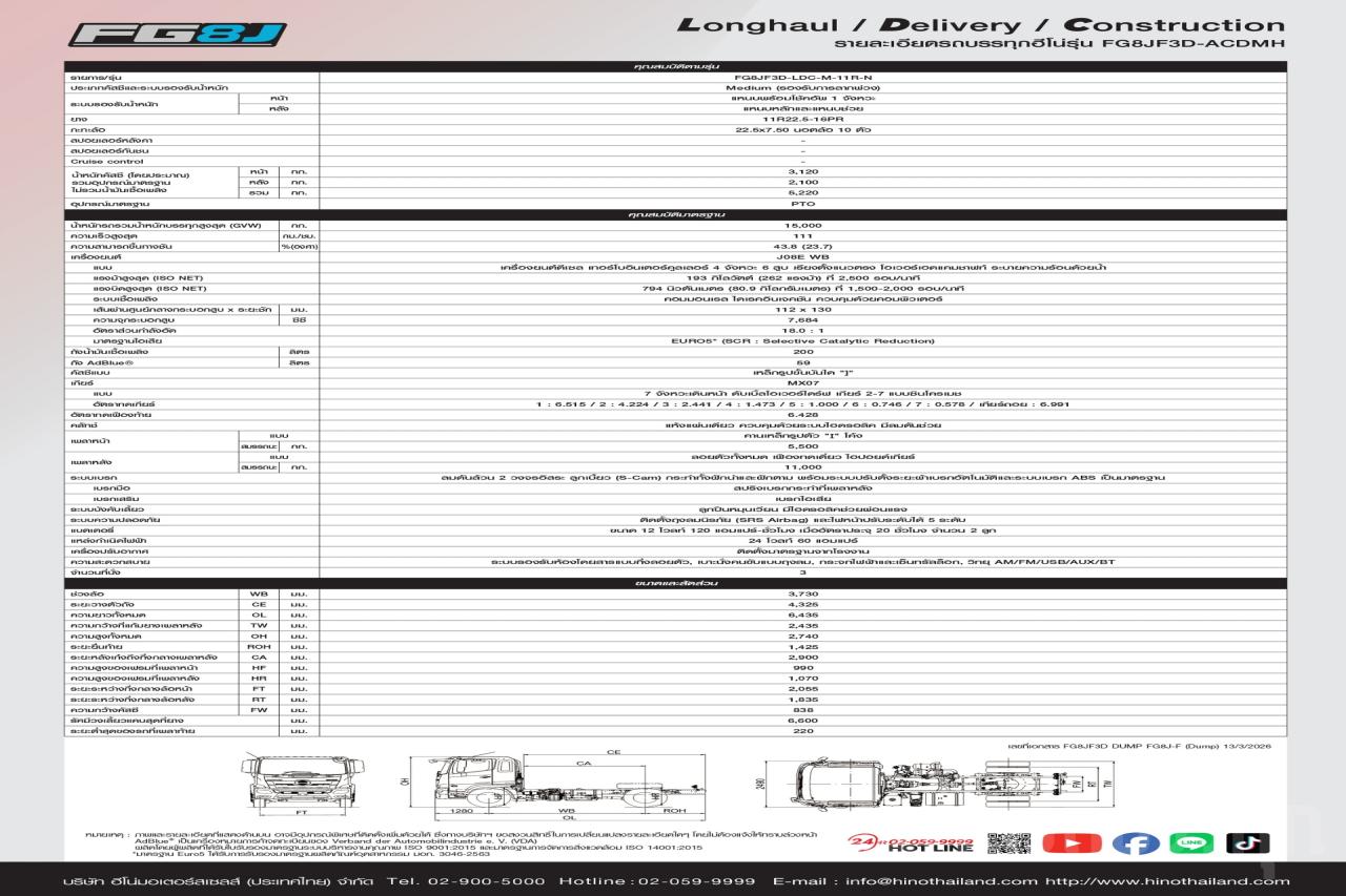 ความยาวกระบะบรรทุก ประมาณ 7.7 เมตร ถังน้ำมัน ขนาดใหญ่ 200 ลิตร น้ำหนักบรรทุกรวม 15 ตัน